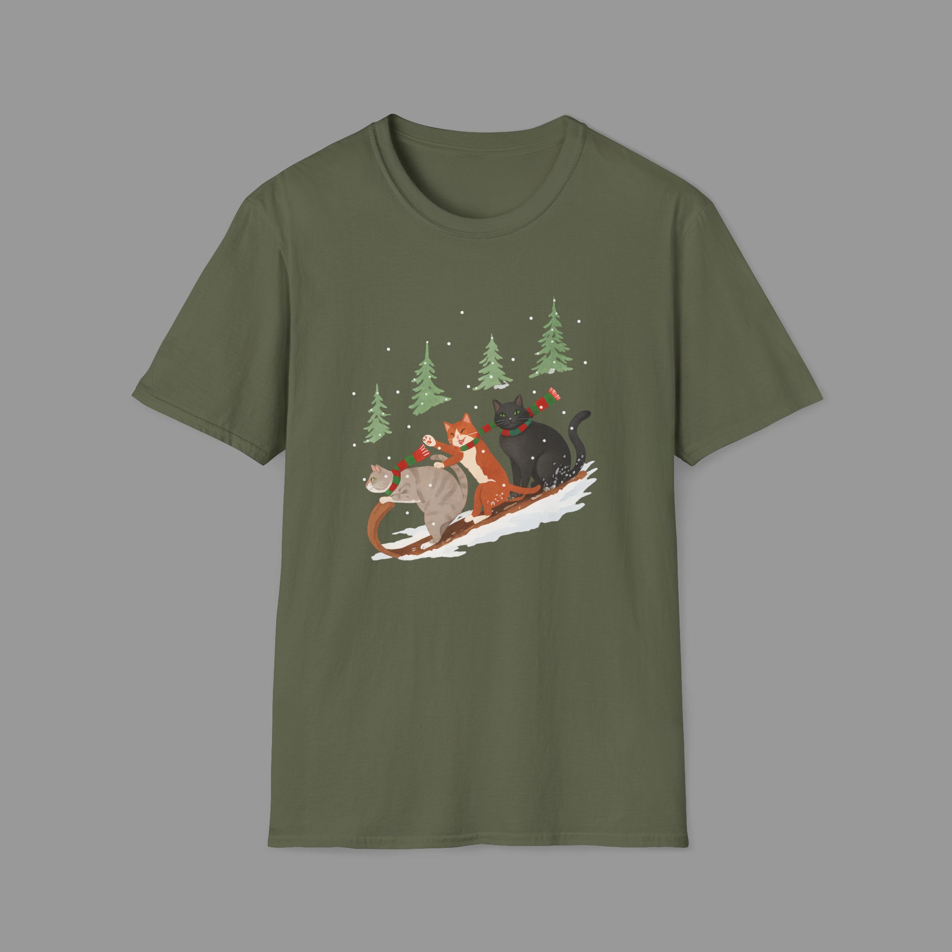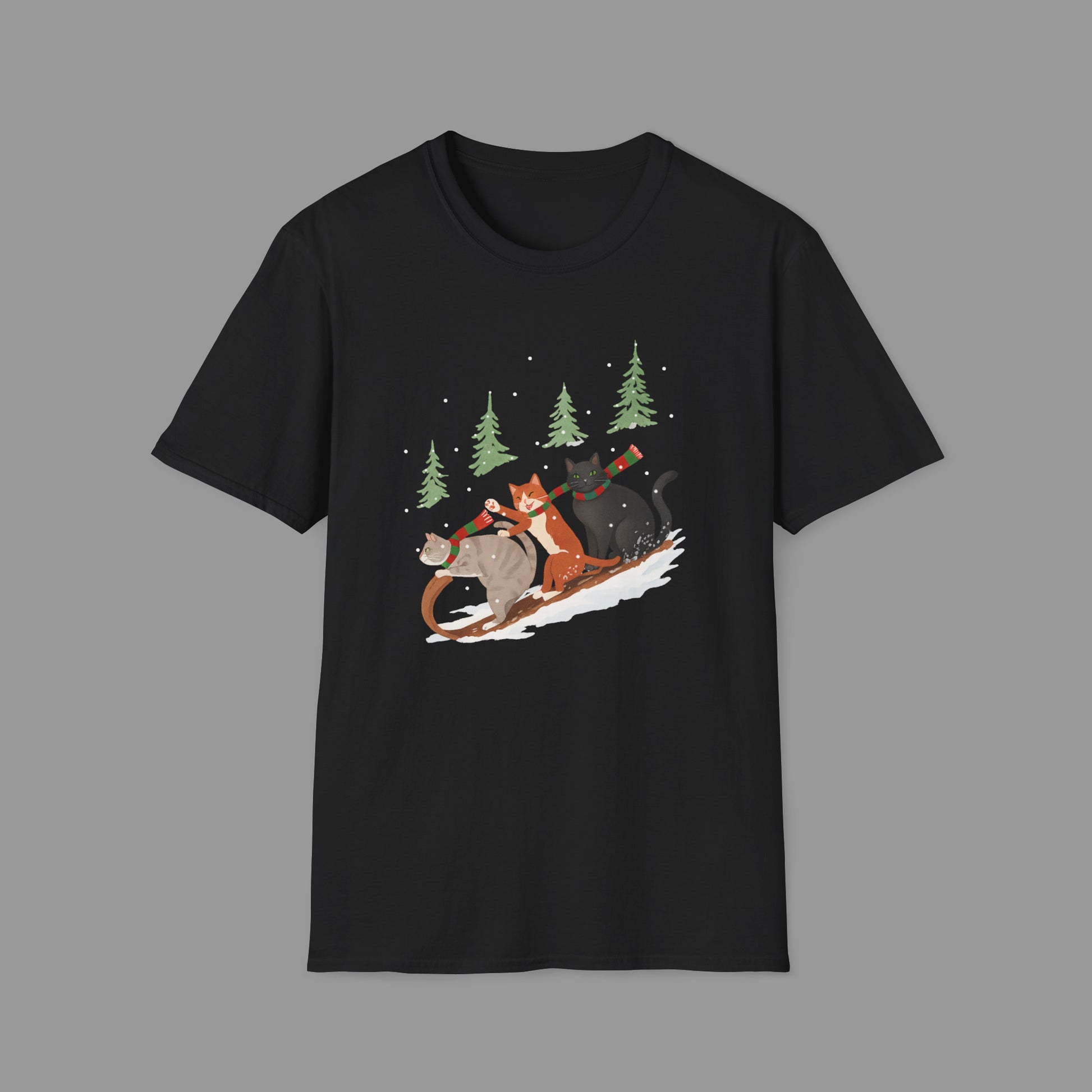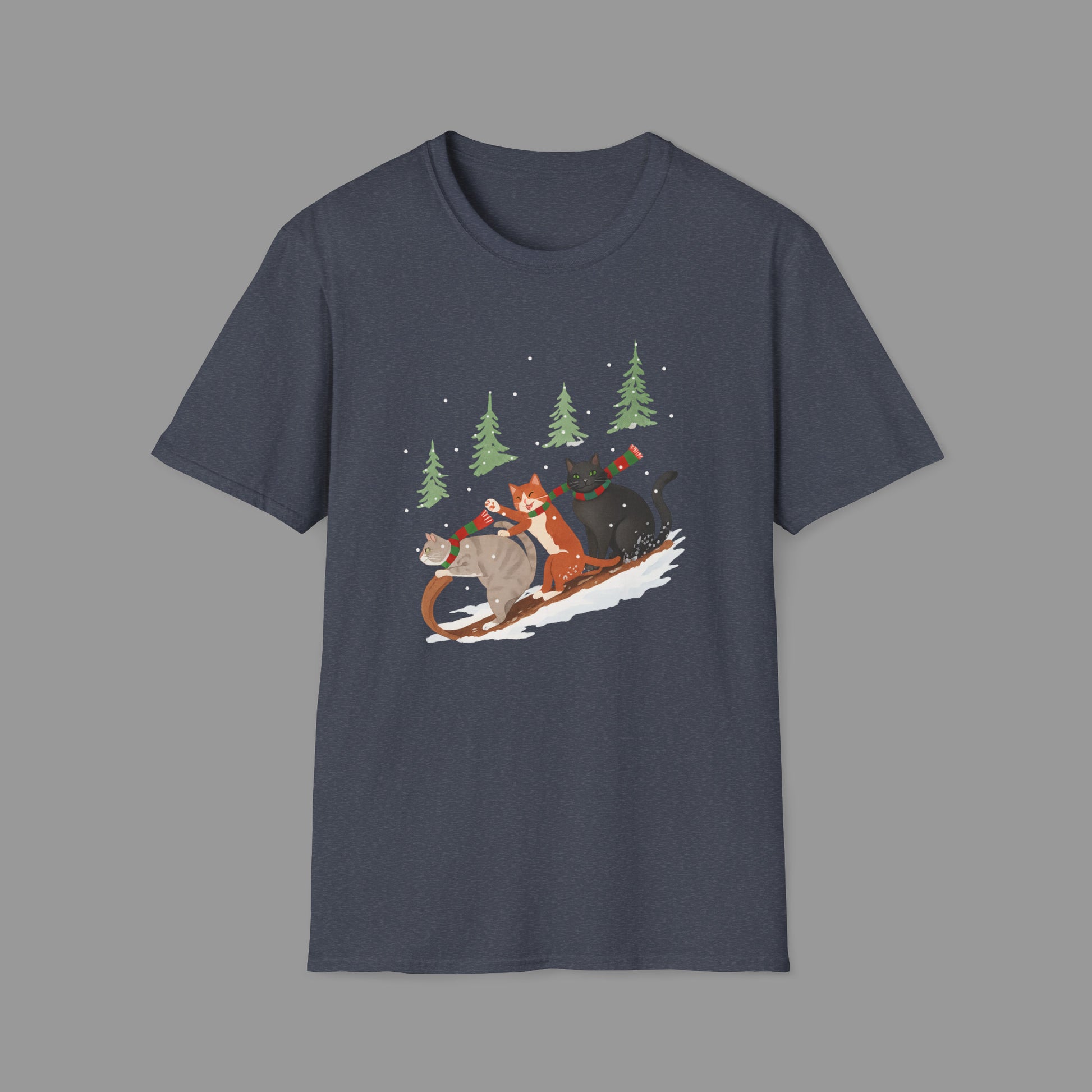 PAWSUPREMACY – Winter Cats Christmas T Shirt with Cozy Snowy Forest Scene Playful Sledding Cat Lover Graphic Tee for Holiday Season.